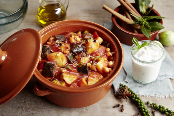 Vor allem ab dem Herbst freuen wir uns besonders über warme Speisen. Ein farbenfroher Magenwärmer, der gleichzeitig auch zu Hause in Urlaubsstimmung versetzt, ist ein orientalischer Kartoffeltopf. Neben den leckeren Knollen entführen uns Kichererbsen, Auberginen und Joghurtsoße geschmacklich in die Welt von Tausendundeine Nacht. Original in einer Tajine zubereitet oder in einer feuerfesten Form im Ofen, ist das bunte Herbstgericht leicht gekocht. Hierfür zunächst eine Brühe aus Knoblauch, Zwiebeln, Ingwer, Sojasoße, Zitronensaft, Salz, Pfeffer und der Gewürzmischung Ras el Hanout anrühren. Danach die Brühe, Kartoffeln, Tomaten, Auberginen und gekochte Kichererbsen in die Tajine oder die ofenfeste Form geben und im Backofen schmoren lassen. Zitronenthymian, Zitronensaft, Salz und Pfeffer verfeinern das kräftig-würzige Gericht mit einer säuerlichen Note. Als Topping sorgt Joghurt mit Zitronensaft und Olivenöl für einen frischen Geschmack.