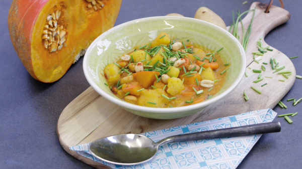 Wärmt auf und gibt Kraft: Kartoffel-Kürbiseintopf mit Erdnuss-Topping. Quelle: KMG/die-kartoffel.de