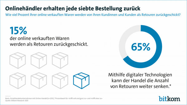 Das Onlinegeschäft ist gerade in Corona-Zeiten ein wichtiges Standbein für viele Einzelhändler geworden. Der Umgang mit Retouren wird dabei zur großen Herausforderung. „Für die Onlinehändler bedeuten Retouren einerseits einen Umsatzverlust und andererseits zusätzliche Personal- und Prozesskosten. Für die Umwelt führen Retouren zu mehr CO2-Ausstoß durch zusätzliche Lieferwege und mehr Verpackungsmüll“, sagt Bitkom-Hauptgeschäftsführer Dr. Bernhard Rohleder. „Mithilfe digitaler Technologien wie KI, Big Data oder Virtual Reality können Kaufentscheidungen zuverlässiger getroffen werden.“
