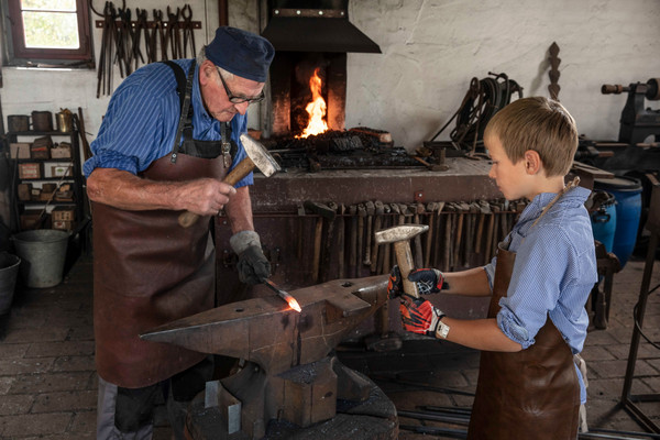 Oberschwäbisches Museumsdorf Kürnbach. Im Museumsdorf Kürnbach können Besucher bei Sonntagsveranstaltungen den Museumshandwerkern über die Schulter schauen und sich auch selbst versuchen – etwa beim Schmieden. Bildnachweis: Landratsamt Biberach