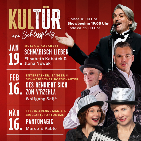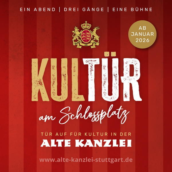Ab Januar 2026 wird der Stuttgarter Schlossplatz zum Treffpunkt für alle, die Kultur lieben – mit einer neuen Reihe, die Schwung in den Wochenstart bringt: KULTÜR am Schlossplatz. Einmal im Monat heißt es: „Ein Abend. Drei Gänge. Eine Bühne.“ In den stilvollen Banketträumen der Alten Kanzlei treffen feine Küche, große Bühnenmomente und schwäbischer Charme aufeinander – für einen kulturellen Wochenauftakt der besonderen Art. Das Konzept ist so einfach wie genial: Während das Publikum ein frisch zubereitetes 3-Gänge-Menü mit schwäbischem Einschlag genießt, sorgen Künstlerinnen und Künstler aus Kabarett, Musik, Theater und Literatur für beste Unterhaltung. Ob zum Lachen, Staunen oder Nachdenken – jeder Abend steht für neue Geschichten, neue Stimmen und neue Genussmomente.