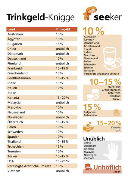 Ist man mit dem Service im Restaurant, Taxi oder Hotel zufrieden, gilt es hierzulande als selbstverständlich, ein Trinkgeld in Höhe von etwa 10 Prozent zu zahlen. Verallgemeinern darf man dies allerdings nicht, denn im Ausland gelten andere Regeln: Während man in dem einem Land mit diesem Trinkgeld knauserig wirkt, fühlt man sich anderswo dadurch persönlich gekränkt. Damit der gut gemeinte „Tip“ auf Reisen nicht zum Affront wird, haben die Reiseexperten von seeker (https://www.seeker.info/), dem smarten Reiseassistenten, den Trinkgeld-Knigge erstellt und zusammengefasst, wo wie viel Trinkgeld üblich beziehungsweise unüblich ist.