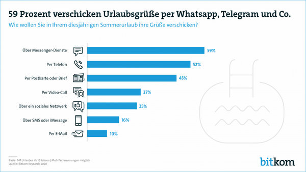 Wetter gut, Essen lecker und das Hotel ist eigentlich auch ganz schön: Grüße aus den Ferien zu verschicken, gehört für fast alle Urlauber (88 Prozent) zum Sommer dazu. Am häufigsten werden in diesem Jahr dafür Messenger-Dienste genutzt: Fast 6 von 10 Urlaubern (59 Prozent) wollen ihre Grüße per Whatsapp, Telegram und Co. verschicken. Das gilt vor allem für jüngere Reisende: 80 Prozent der 16- bis 29-Jährigen sagen dies, 64 Prozent der 30- bis 49-Jährigen und 58 Prozent der 50- bis 64-Jährigen. Bei den über 65-Jährigen will immerhin noch jeder Dritte (33 Prozent) seine Urlaubsgrüße per Messenger verschicken. Das sind die Ergebnisse einer repräsentativen Befragung im Auftrag des Digitalverbands Bitkom unter 1.002 Personen in Deutschland ab 16 Jahren.